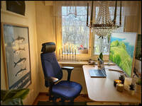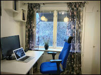 HusHelt rum ca 8 kvm hemmakontor med extern skärm, höj- och sänkbart skrivbord samt kontorsstol. Mkt bra ljusinsläpp pga två fönster direkt i anslutning till skrivbordet. |